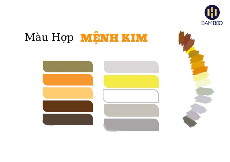 | Kim | Trắng, bạc, xám | Vàng đất, nâu | Đỏ, hồng, cam |